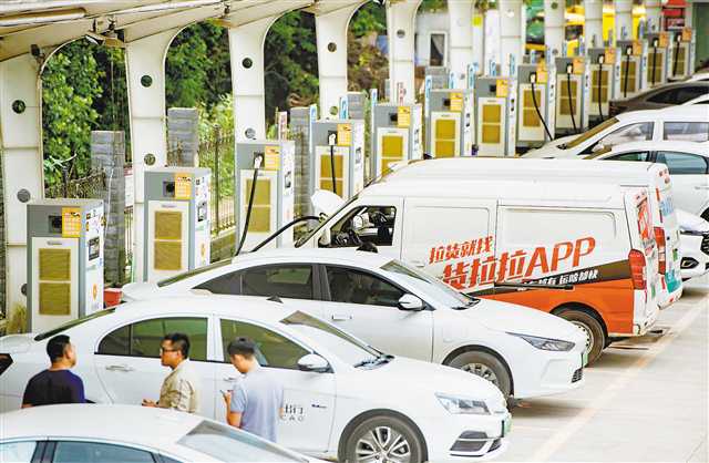 渝北區三亞灣水產交易市場旁的星星充電站,不少車輛在此充電。在運營車輛充電高峰期,該充電站70個充電車位幾乎“滿員”。(攝于7月3日)記者 張錦輝 攝/視覺重慶