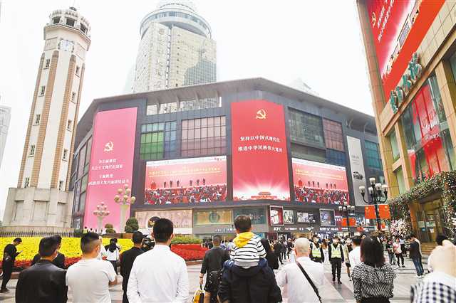 10月23日,解放碑LED大屏幕前,市民們正在觀看二十屆中共中央政治局常委同中外記者見面會直播。特約攝影 鐘志兵/視覺重慶