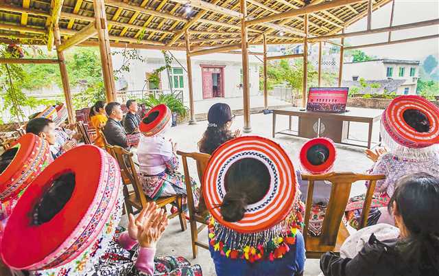 10月23日,綦江區安穩鎮上壩村,黨員干部與當地苗族同胞收看二十屆中共中央政治局常委同中外記者見面會直播。特約攝影 陳星宇/視覺重慶