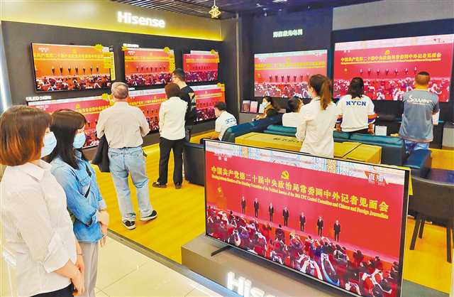 10月23日,江北區觀音橋步行街,市民在商場內觀看二十屆中共中央政治局常委同中外記者見面會直播。記者 崔力 攝/視覺重慶
