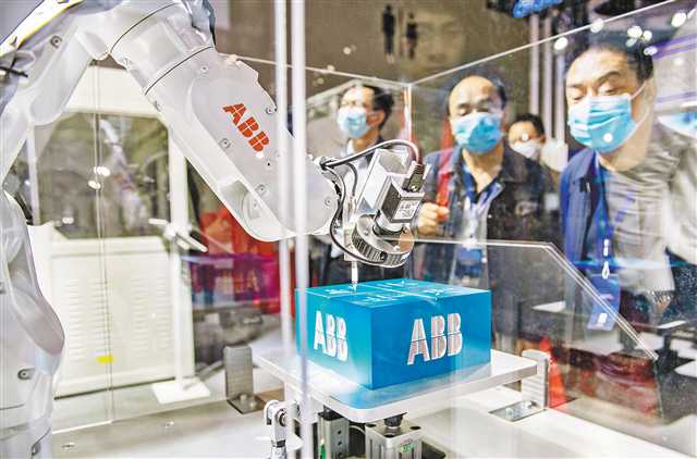 重慶國際博覽中心舉辦的2021全球半導體產業(重慶)博覽會上,ABB中國帶來的一款機器人正在展示其自動標定功能。記者 張錦輝 攝/視覺重慶