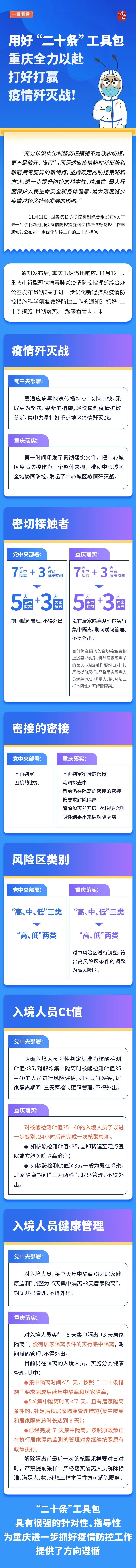 11月12日,?重慶市新冠肺炎疫情防控指揮部綜合辦公室發布通知,要求各區縣、市級有關部門和有關單位將“二十條措施”貫徹落實到現有疫情處置工作中,其中對隔離時間、密接的密接等均對標“二十條措施”作了進一步調整部署。一張長圖,帶你快速了解↓↓↓