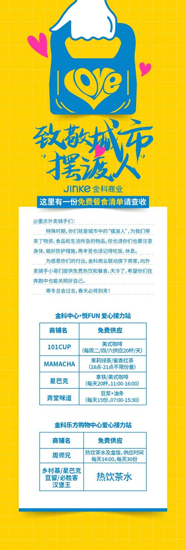金科商業聯動商家為外賣騎手提供免費餐食熱飲