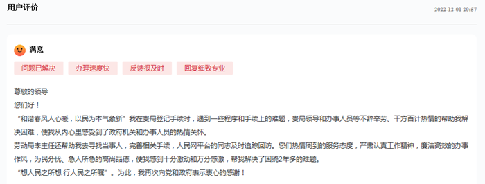 人民網重慶12月5日電 (陳琦)“想人民之所想,行人民之所囑,萬分感激勞動局和人民網平臺的同志幫我解決了困擾2年多的欠薪難題?!苯?,重慶奉節縣一網友在人民網“領導留言板”上給重慶市市長胡衡華留言表達感謝。