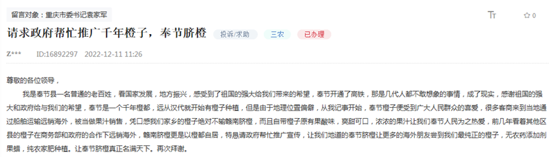 又到一年橙香時。楊守江看著自己辛苦種植的臍橙迎來豐收,心里卻喜憂參半,他為掛滿枝頭的一顆顆甜蜜臍橙的銷售發起了愁。同時,他也希望擴大銷路讓更多海外朋友能品嘗到家鄉的臍橙。2022年12月12日,楊守江通過“領導留言板”給新任重慶市委書記袁家軍留言建議:請求政府幫忙推廣宣傳,讓更多的海外朋友嘗到我們地道的奉節臍橙,讓奉節臍橙真正名滿天下!