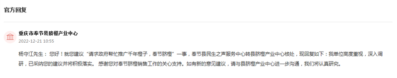 2022年12月21日,奉節縣臍橙產業中心對網友留言進行了回復:就您建議“請求政府幫忙推廣千年橙子,奉節臍橙”一事,已采納建議并將積極落實。人民網在回訪中了解到,奉節縣臍橙產業中心已邀請楊守江參加1月6日在渝舉行的第四屆重慶奉節國際“橙博會”,幫助農戶提高臍橙銷售量,擴大奉節臍橙品牌影響力。