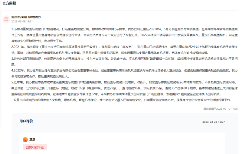 收到群眾留言后,重慶市政府口岸物流辦于2月9日對網友提出的疑問和建議進行了逐條詳實的回復: