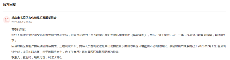 在回復中,北碚區文旅委首先對游客的建議表達了謝意。并表示當時景區智能廣播系統剛安裝完成,正處于調試階段,安裝人員在調試過程中出現播放音樂曲目與景區環境氛圍不協調的情況。“目前,景區智能廣播系統已全部調試完成,曲目均以古箏、笛子等配樂為主,包括有《俠客行》等與景區環境氛圍配搭的歌曲?!?/strong>北碚區文旅委回應。