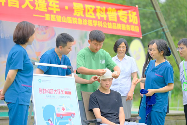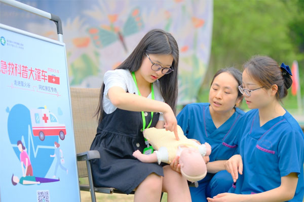 5月15日,重慶醫科大學附屬璧山醫院(重慶市璧山區人民醫院)急診醫學科開啟“120急救科普大篷車”公益品牌項目?;顒右浴傲憔嚯x”“面對面”的形式,把急診急救知識分批次帶到景區、企業、校園、工廠等群眾身邊,并結合不同人群的工作特點,針對易發或高發的安全風險,開展心肺復蘇、海姆立克法、動物致傷等技能培訓,普及急救基本理念和技能。
