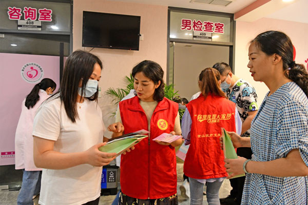 志愿者為新人發放宣傳資料。璧山區婦幼保健院供圖