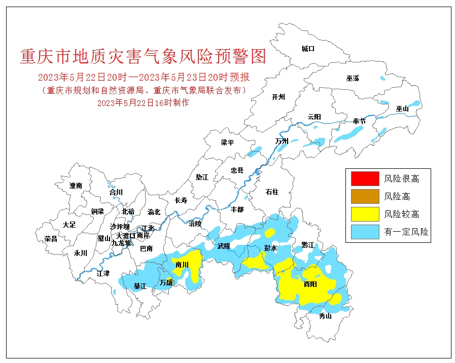 5月22日16時,重慶市規劃和自然資源局、重慶市氣象局聯合發布全市地質災害氣象風險預警。