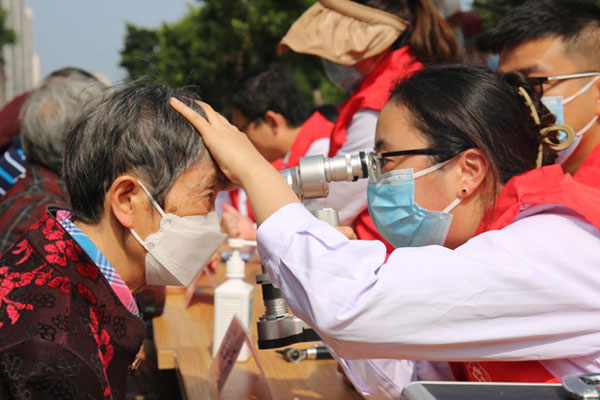 簽約儀式結束后,由醫院康復醫學科、神經科、呼吸內科、心血管內科等科室醫務人員組成的義診團隊從飲食、運動等方面向居民提供健康指導和宣教,并在現場開展中醫適宜技術體驗,為患者貼耳穴、測血壓、檢查眼部健康等。
