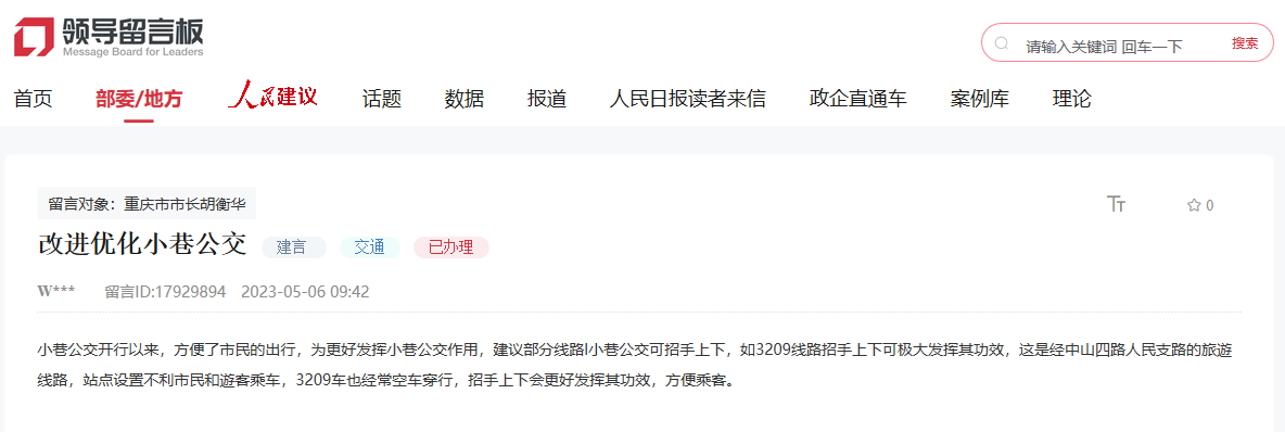 人民網重慶6月9日電 (陳琦)“小巷公交開行以來,方便了山城市民的出行,為更好發揮小巷公交作用,建議部分線路能招手上下”。近日,有網友通過人民網“領導留言板”提出優化小巷公交的建議獲回復辦理。