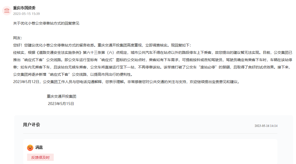 收悉該留言后,重慶交通開投集團高度重視,立即調查核實。并于5月15日作出回復。
