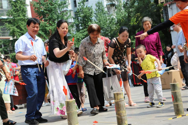 包粽子比賽結束后,形式多樣的游園活動隨之展開?!鞍?!沒投中?!薄耙?!我中了4個,可以獲得2個積分?!痹谕秹丨h節,居民們站在規定距離外,屏氣凝神,依次將手中的十支木箭投入前方木質容器內。其中,有的木箭準確地落在壺內,有的木箭與壺口擦肩而過,但無論投中與否,大家都在過程中享受著輕松與愉悅的節日氛圍。