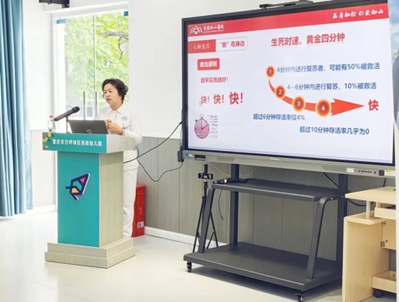 此次急救培訓由松山醫院心血管病醫院護士長張藝帶隊,課堂上,張藝進行了生命的CPR(心肺復蘇術)和海姆立克法急救宣傳講座。張藝介紹,其實危險離我們很近,它隨時可能發生在周圍大眾人群,不會急救、不知道如何急救,很可能會失去摯愛親友,但是如果我們學會了急救,就可能挽回生命,避免不幸的發生。