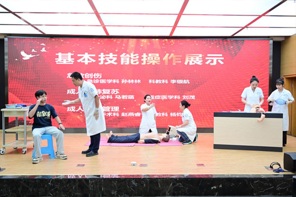 在基本技能操作展示環節,6名院前醫務人員進行了“急救創傷操作”“成人心肺復蘇操作”“成人氣道管理操作”技能展示。