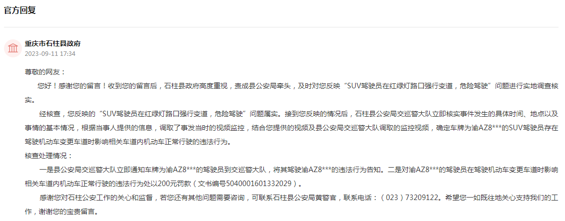 9月11日, 重慶市石柱縣政府對李先生的留言進行了回復:經核查,您反映的“SUV駕駛員在紅綠燈路口強行變道,危險駕駛”問題屬實。接到您反映的情況后,石柱縣公安局交巡警大隊立即核實了基本情況,結合您提供的視頻及縣公安局交巡警大隊調取的監控視頻,確定該駕駛員存在駕駛機動車變更車道時影響相關車道內機動車正常行駛的違法行為。