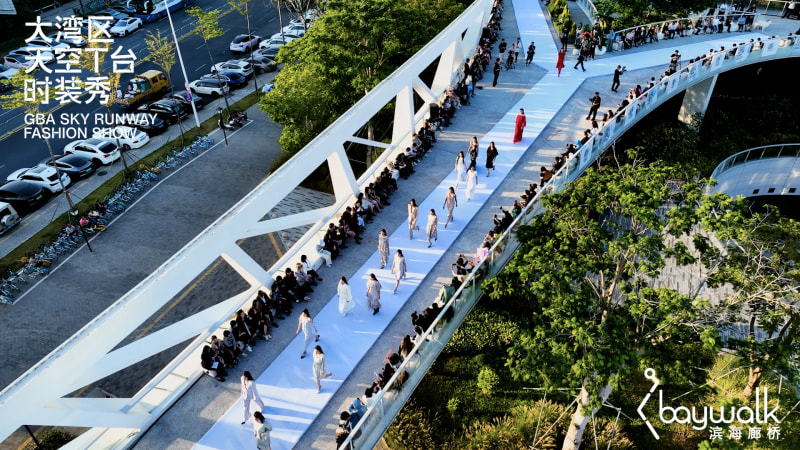 12月7日,深圳寶安濱海廊橋上演“大灣區天空T臺時裝秀”,身穿新式旗袍、干練套裝或時尚單品的模特們,在動感音樂中逐一亮相。