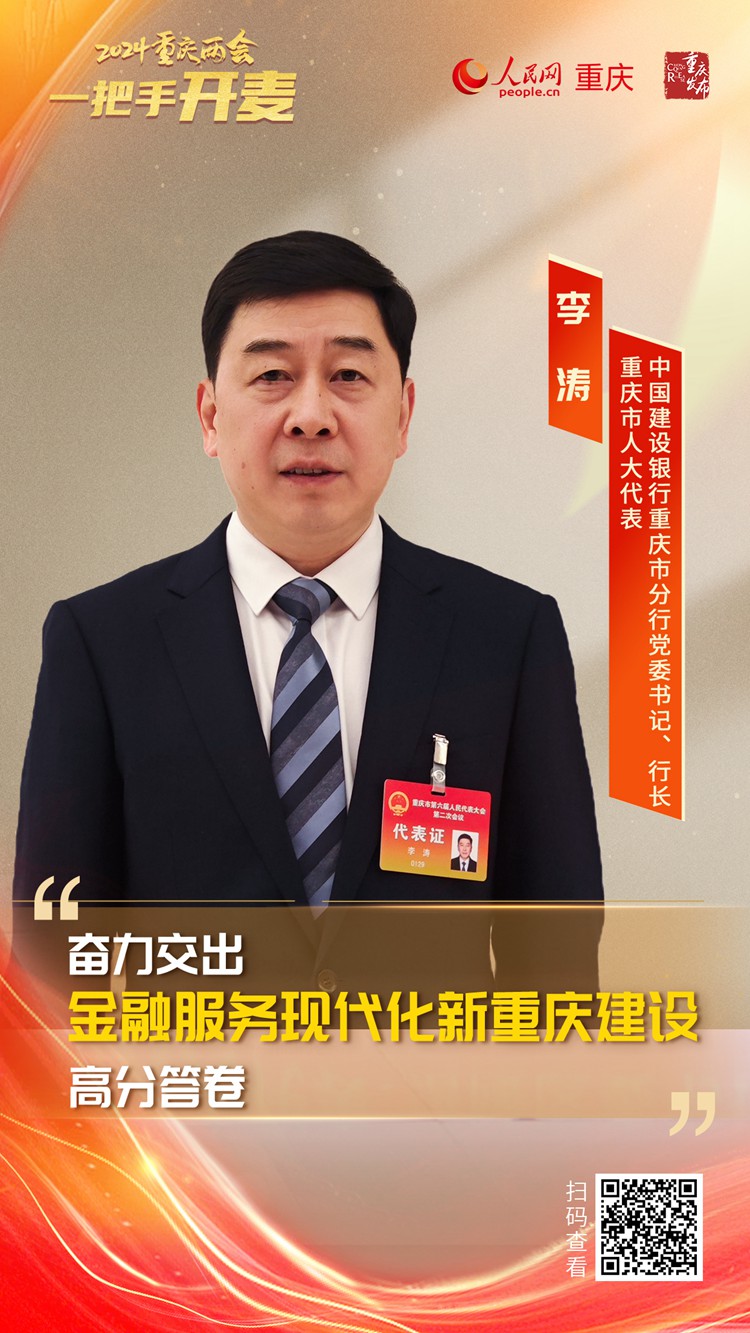 人民網重慶1月23日電 2024重慶兩會期間,重慶市人大代表,中國建設銀行重慶市分行黨委書記、行長李濤在接受人民網專訪時表示,該行將始終胸懷“國之大者”,不斷增強金融工作的政治性、人民性、專業性,緊緊圍繞成渝地區雙城經濟圈、西部陸海新通道建設等重大戰略,持續提升“三個能力”,全力做好科技金融、綠色金融、普惠金融、養老金融、數字金融五篇大文章,全力服務“三大工程”以及“三攻堅一盤活”等重點工作任務,以實干擔當奮力交出金融服務現代化新重慶建設的高分答卷。