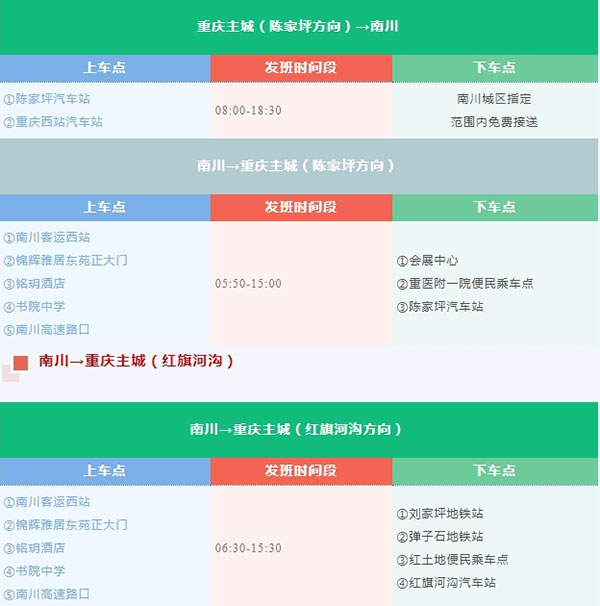 即日起,城際快客“重慶主城? 南川”新增陳家坪、紅旗河溝方向線路。重慶主城多點約客上(下)車,南川城區指定范圍內免費接送。線路班次等詳情如下: