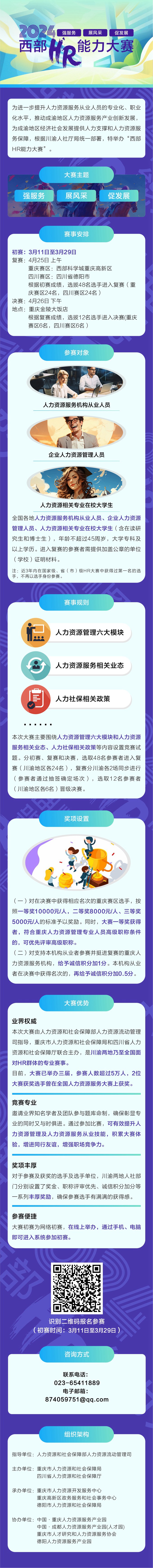 據了解,此次大賽報名資格囊括人力資源行業各方面群體,全國各地人力資源服務機構從業人員、企業人力資源管理人員、人力資源相關專業在校大學生等均可報名參賽。參賽選手可在3月11日至3月29日期間,通過“中國重慶人力資源服務產業園”微信公眾號“HR大賽”欄目或掃描長圖內二維碼報名及網絡答題。