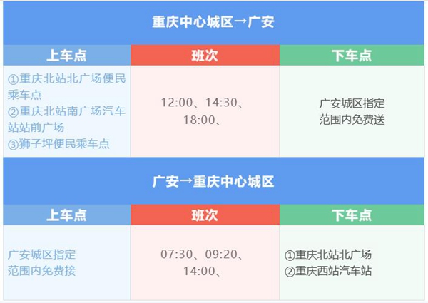 城際快客“重慶往返廣安”為7座商務車,單程票價89元/人。該線路在重慶主城多點約客上(下)車,在廣安指定范圍內免費接送,其站點、班次等如下: