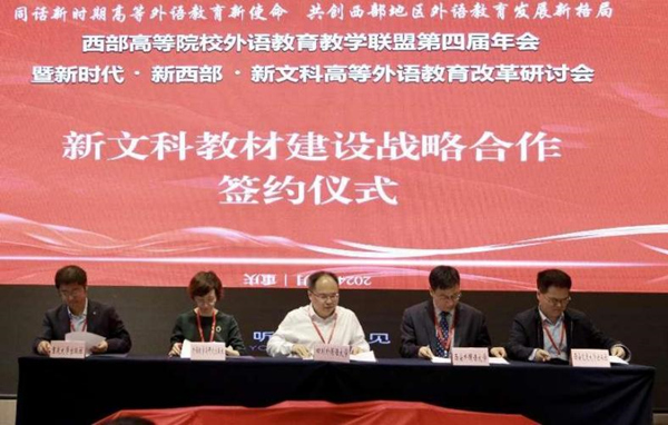 會上,四川外國語大學、西安外國語大學、外語教學與研究出版社、重慶大學出版社、西安交通大學出版社共同簽署了《新文科教材建設戰略合作》,會議還同期發布了西部外語教材建設成果并舉行了重慶市大學生多語種國際傳播力大賽啟動儀式。(林果、唐文蕤)