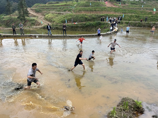“我捉到啦!豐收啦!”另一塊田里,手捧一條大草魚的小男孩興奮地叫起來,忙不迭地向眾人展示他的“戰利品”。