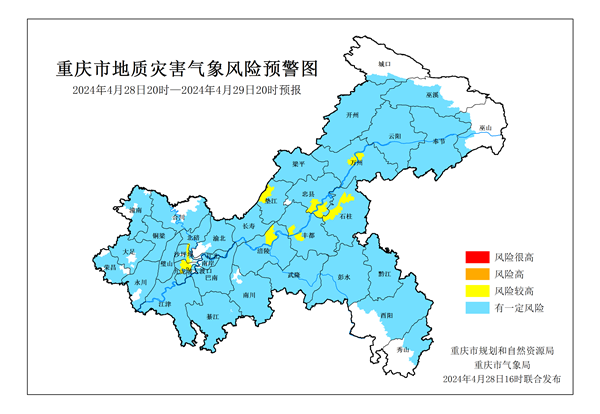 4月28日16時,重慶市規劃和自然資源局、重慶市氣象局聯合發布全市地質災害氣象風險預警。
