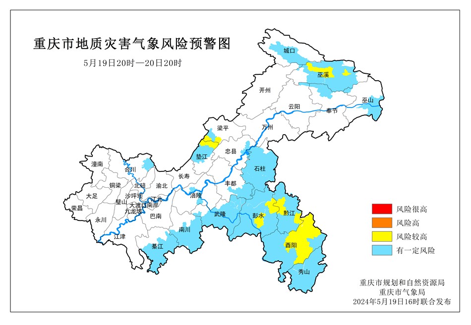 5月19日20時至5月20日20時,巫溪縣、墊江縣、梁平區、彭水縣、黔江區、酉陽縣屬于風險較高地區,地質災害氣象風險等級為III級(黃色預警),城口縣、巫山縣、奉節縣、云陽縣、石柱縣、豐都縣、忠縣、涪陵區、萬盛經開區、南川區、武隆區、秀山縣、合川區屬于有一定風險地區,地質災害氣象風險等級為IV級(藍色預警),請相關區縣注意防范。