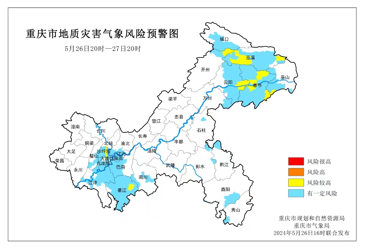 5月26日20時至5月27日20時,巫山縣、巫溪縣、奉節縣、云陽縣、開州區、萬盛經開區、沙坪壩區屬于風險較高地區,地質災害氣象風險等級為III級(黃色預警),城口縣、萬州區、石柱縣、江津區、綦江區、南川區、彭水縣、黔江區、酉陽縣、秀山縣、璧山區、北碚區、巴南區、渝中區、南岸區、重慶高新區、九龍坡區、大渡口區、兩江新區屬于有一定風險地區,地質災害氣象風險等級為IV級(藍色預警),請相關區縣注意防范。