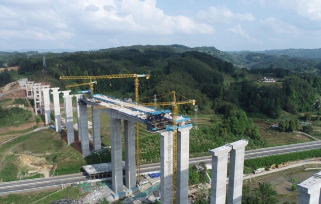 下柏樹灣大橋是武兩高速全線重點控制性工程之一,大橋位于重慶涪陵區龍潭鎮下柏樹灣,由中鐵二院設計、中鐵六局太原公司承建。大橋全長701米,共有17跨,跨越馬龍路、S102省道及龍潭河,上跨形式為2×65mT型剛構箱梁,最大墩高78米。