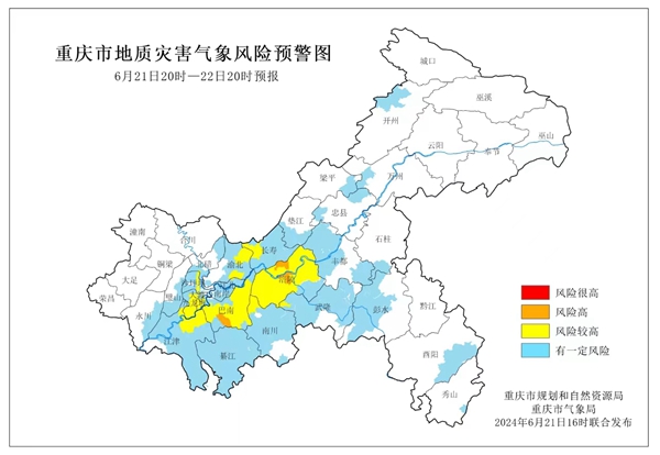 6月21日16時,重慶市規劃和自然資源局、重慶市氣象局聯合發布全市地質災害氣象風險預警。