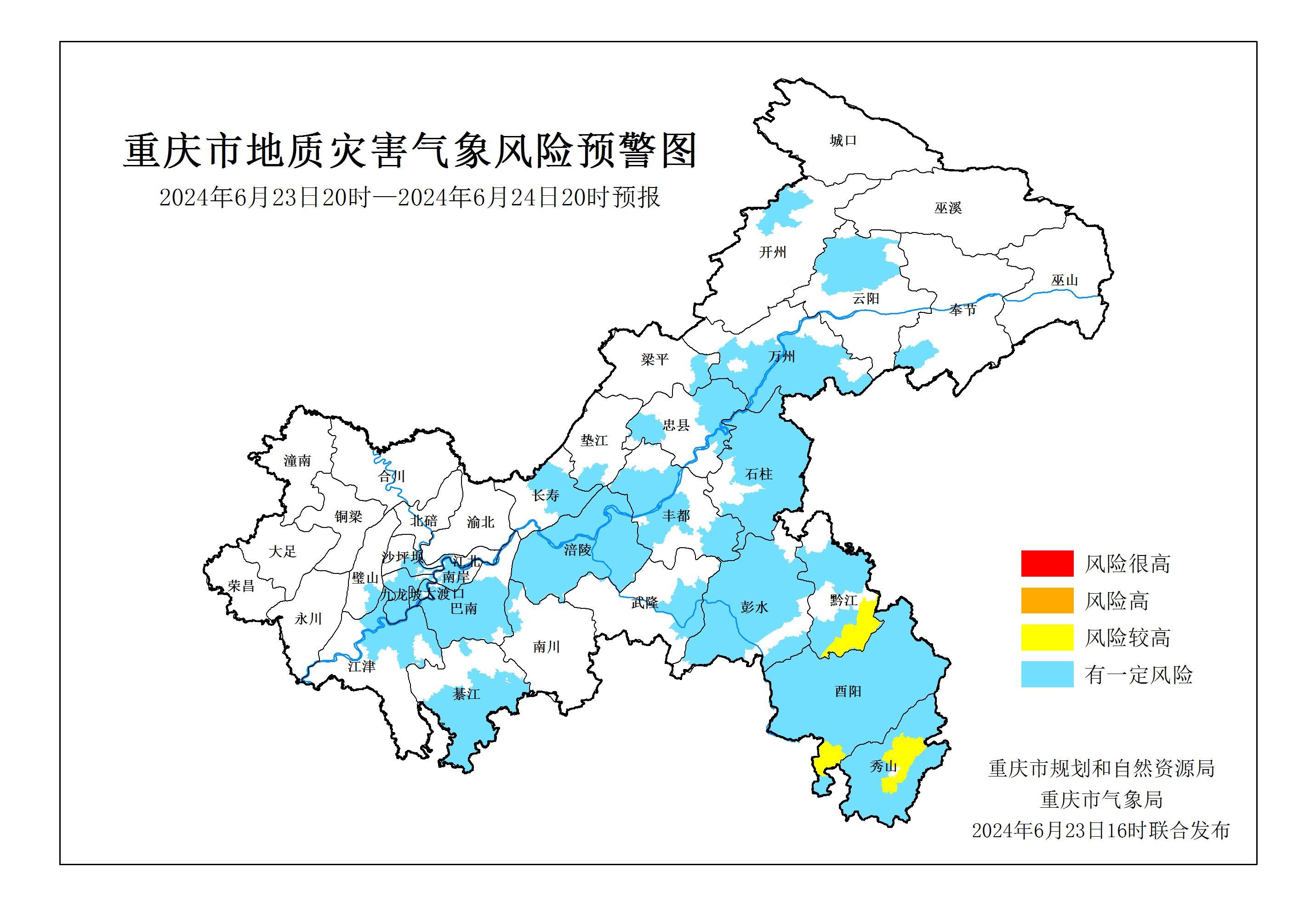 6月23日20時至6月24日20時,黔江縣、酉陽縣、秀山縣屬于風險較高地區,地質災害氣象風險等級為III級(黃色預警),奉節縣、云陽縣、開州區、萬州區、石柱縣、豐都縣、忠縣、涪陵區、長壽區、墊江縣、梁平區、江津區、綦江區、萬盛經開區、南川區、武隆區、彭水縣、璧山區、渝中區、南岸區、重慶高新區、沙坪壩區、九龍坡區屬于有一定風險地區,地質災害氣象風險等級為IV級(藍色預警),請相關區縣注意防范。