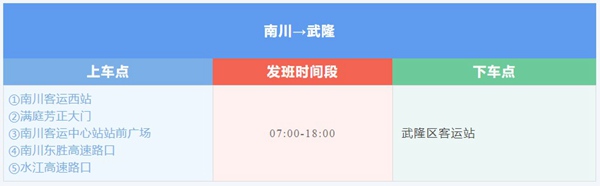 城際快客南川至武隆為14座商務車,單程票價36元/人起,南川多點約客上車,其線路詳情如下: