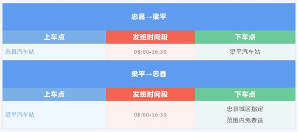 城際快客忠縣至梁平為9座商務車,單程票價40元/人。其線路詳情如下: