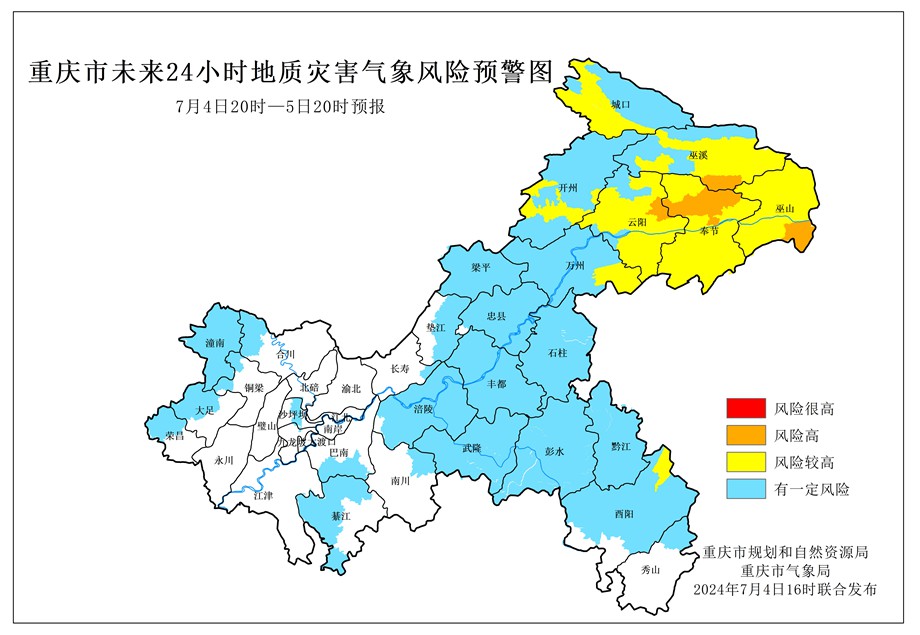 7月4日20時至7月5日20時,巫山縣、巫溪縣、奉節縣、云陽縣屬于風險高地區,地質災害氣象風險等級為II級(橙色預警),城口縣、開州區、萬州區、酉陽縣屬于風險較高地區,地質災害氣象風險等級為III級(黃色預警),石柱縣、豐都縣、忠縣、涪陵區、長壽區、墊江縣、梁平區、綦江區、萬盛經開區、南川區、武隆區、彭水縣、黔江區、秀山縣、潼南區、大足區、榮昌區、銅梁區、合川區、巴南區、重慶高新區、沙坪壩區屬于有一定風險地區,地質災害氣象風險等級為IV級(藍色預警)。