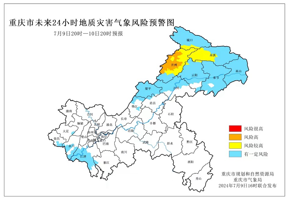 7月9日20時至7月10日20時,開州區屬于風險高地區,地質災害氣象風險等級為II級(橙色預警),城口縣、巫溪縣、云陽縣屬于風險較高地區,地質災害氣象風險等級為III級(黃色預警),巫山縣、奉節縣、萬州區、忠縣、墊江縣、梁平區、江津區、綦江區、大足區、榮昌區、永川區屬于有一定風險地區,地質災害氣象風險等級為IV級(藍色預警)。