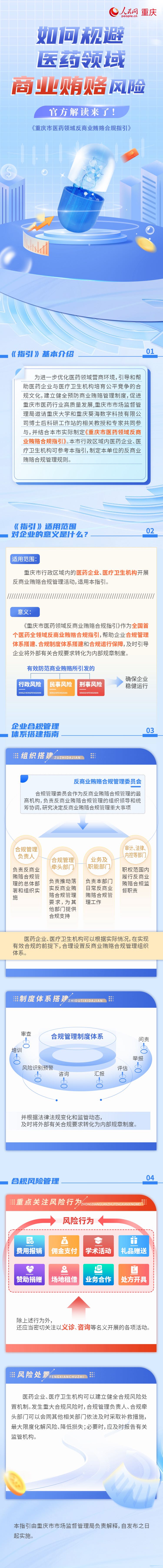 人民網重慶7月12日電 (記者胡虹)為優化醫藥領域營商環境,引導和幫助醫藥企業與醫療衛生機構培育公平競爭的合規文化,12日,重慶市市場監督管理局印發了《重慶市醫藥領域反商業賄賂合規指引》(簡稱:《指引》)。 據重慶市市場監督管理局相關負責人介紹,《指引》分為六章、三十二條,包括總則、合規管理組織、合規風險管理、合規制度建設、合規運行保障、附則等內容?!?/a>
