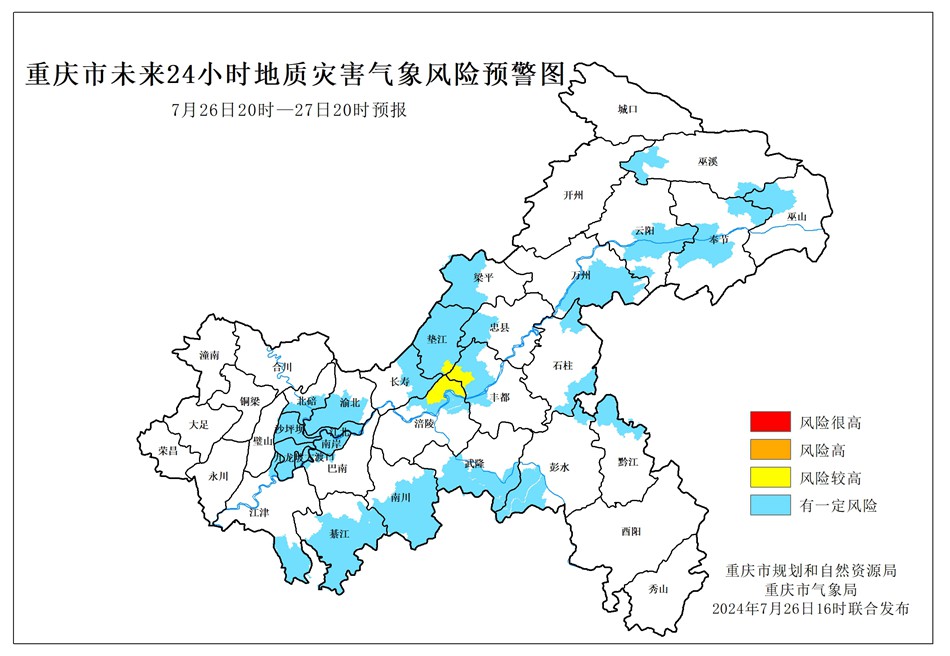 7月26日16時,重慶市規劃和自然資源局、重慶市氣象局聯合發布全市地質災害氣象風險預警。