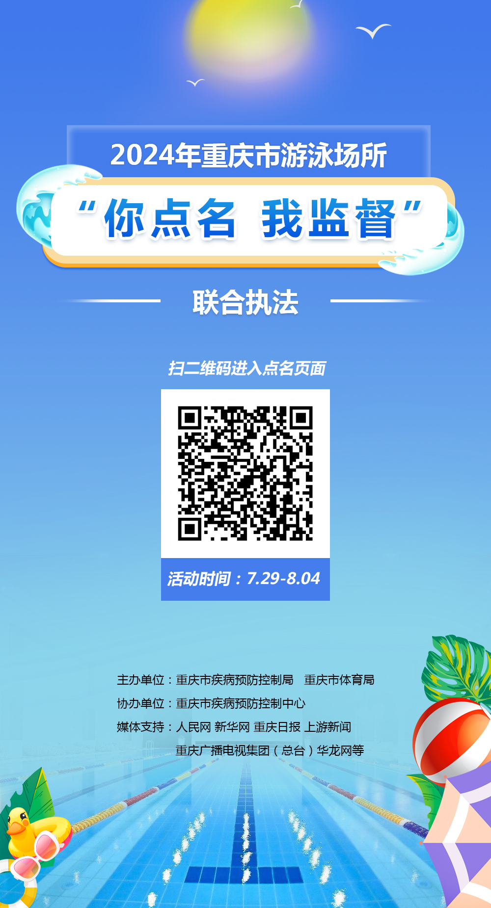 據介紹,7月29日至8月4日,重慶市民可以通過“重慶疾控”官方發布的活動二維碼進入活動頁面點名,點名的對象范圍為當前全市所有合法且正常營業的游泳場所,每人可以點名1—3家游泳場所,每個IP地址每天只能點名1次。