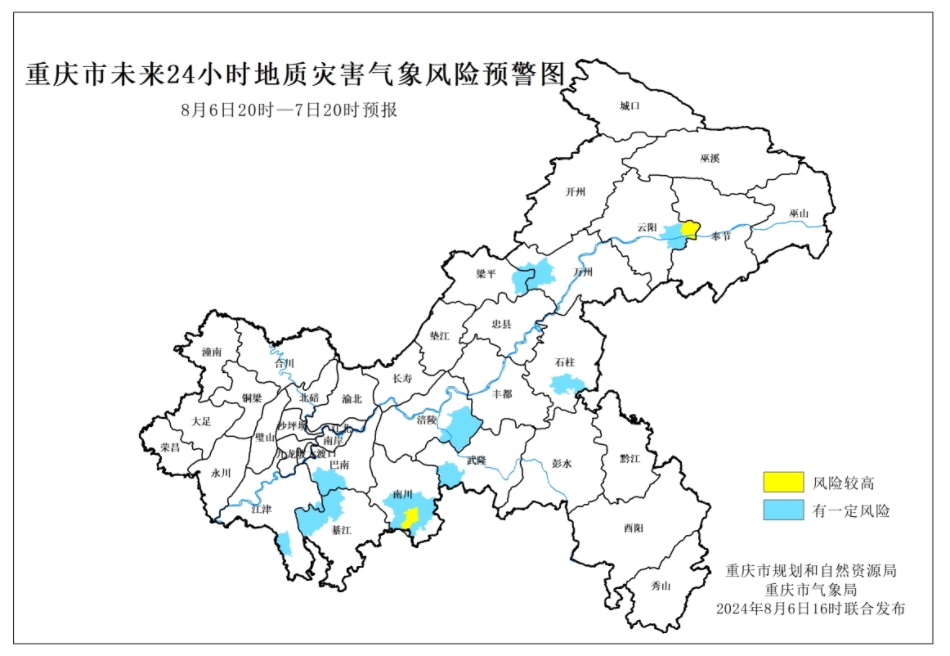 8月6日16時,重慶市規劃和自然資源局、重慶市氣象局聯合發布全市地質災害氣象風險預警。
