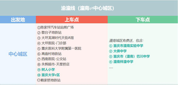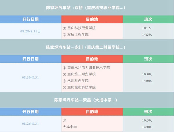 此外,在大巴車線路方面,8月26日起,陳家坪汽車站將陸續在原雙橋、永川、榮昌等線路上,分別新增重慶科技職業學院、雙橋工程學院、重慶水利電力職業技術學院、重慶第二財貿學校、大成中學等??奎c。