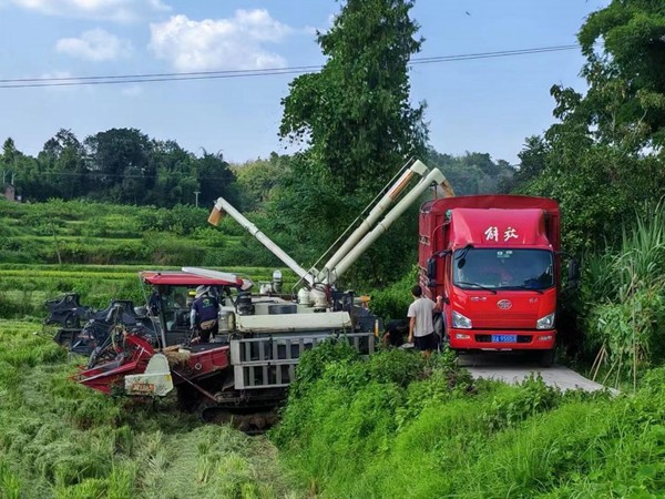 連日來,在重慶市長壽區青云村、利明村和沙河村,收割機開足馬力穿梭田野間,收割、脫粒一氣呵成,轟鳴聲中,一片片稻谷被“收入囊中”。