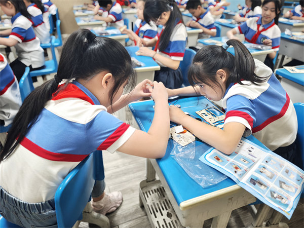 在實踐環節中,環保志愿者帶領學生們動手制作太陽能無線遙控車。通過組裝各個部件,學生們不僅鍛煉了動手能力,還直觀體驗了新能源的實際應用。五年級學生梁森豪興奮地表示:“今天的活動太有趣了,不但學到了碳中和碳達峰的知識,還動手做了太陽能遙控車,只要有太陽就能一直跑呢!”