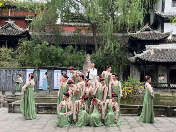 另一個實景節目《竹韻流芳》則講述詩人劉禹錫于竹林深處與一群妙齡少女相遇,共同演繹巴渝民歌竹枝歌舞的故事。演出結合竹枝園場地的天然優勢,把演員打散在園區,讓觀眾出其不意的融入表演里,實現藝術加實景的唯美穿越。
