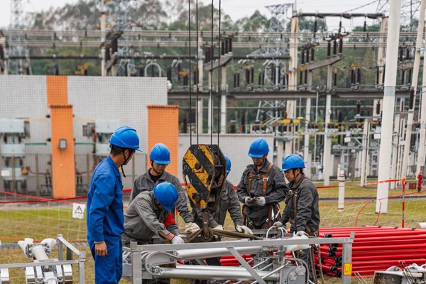 電力員工在220千伏茶店變電站吊裝新刀閘。國網重慶永川供電公司供圖