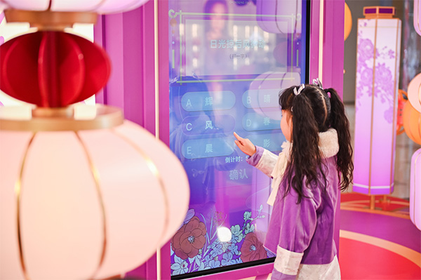 活動現場,呈現出高4.5米、寬5米的新中式秀山花燈,該設計結合了重慶IFS標志性的山茶花元素紋樣,山茶花綻放在秀山花燈之上,裝置呼吸燈呈現漸變的光彩,帶來新年的光明美滿,現場亦可以掃碼猜燈謎,增添了趣味。
