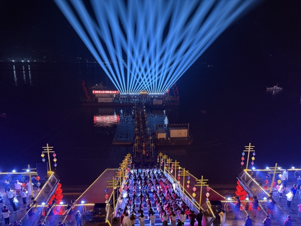 隨后,在夜空中呈現“來豐都祈福,得一生平安”的標語彰顯了豐都祈福文化的核心。特色鳳凰造型的無人機在夜空中盤旋飛舞,最終化作亮光落至躉船舞臺中央,照亮了翩翩起舞的女演員,也預示著祈福港文藝表演的開始。